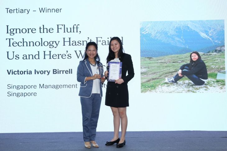 [Featured photo: Victoria Ivory Birrell, SMU social sciences student received her prize from Ms Helena Phua, Executive VP (Asia Pacific), The New…