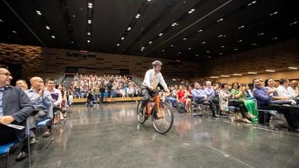 There were gasps of surprise, loud cheers and enthusiastic applause as SMU’s fourth President, Professor Arnoud De Meyer rode his bicycle into the…
