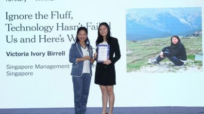 [Featured photo: Victoria Ivory Birrell, SMU social sciences student received her prize from Ms Helena Phua, Executive VP (Asia Pacific), The New…