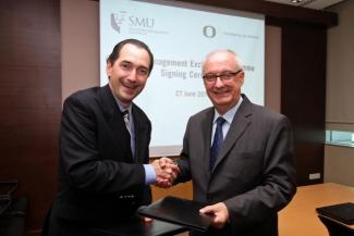 Photo: SMU President Professor Arnoud De Meyer (right) with University of Oregon Vice President for University Advancement Mr Michael Andreasen at the signing ceremony.