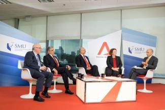 On the panel for the first episode were SMU President Professor Arnoud De Meyer; Mr Piyush Gupta, CEO & Director of DBS Group; Ms Gill McLaren, General Manager (Singapore, Malaysia & Brunei Region) of The Coca-Cola Company; Professor Kishore Mahbubani, Dean of Lee Kuan Yew School of Public Policy; with veteran international journalist Mr Teymoor Nabili as Presenter & Moderator. In the specially invited audience were several of SMU’s most senior leaders, faculty and staff members, students and VIPs in the SMU community.
