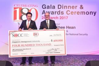 Mr Chaly Mah, Chairman of SICC, presented the Scholarship cheque to SMU President Professor Arnoud De Meyer at the SICC 180th Anniversary Gala Dinner held at Marina Bay Sands today, graced by Guest-of-Honour Deputy Prime Minister Teo Chee Hean.