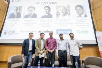 Featured photo: (from left) Mr Joon-Seong Lee, Managing Director at Accenture Applied Intelligence, ASEAN Lead; Mr Laurence Liew, Director of AI Industry Innovation, AI Singapore; Professor Steven Miller, SMU Vice Provost (Research); Dr Jagannadan Varadarajan, Data Science Lead (Machine Learning), Grab and Mr Srikiran Raghavan, Head of APAC, Marketing Partners Program, Facebook at the Artificial Intelligence—Are You Ready? conference organised by SMU on 6 April 2018.