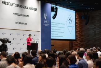 [Photo: A 500-strong audience, comprising SMU staff, faculty, student leaders and alumni, attended the Inaugural Presidential Address held on 12 February 2019.]